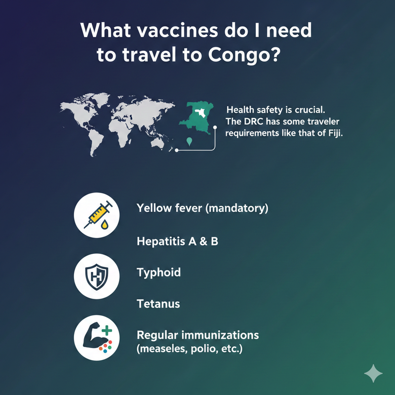 Health safety is crucial. The DRC has some traveler requirements like that of Fiji. Key vaccines include: