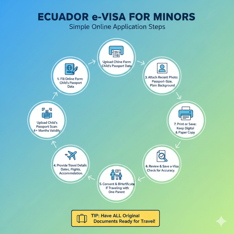 Obtaining an Ecuador e-Visa for a minor through the internet is an uncomplicated task, yet it necessitates appropriate documents and accurate details. Here is a straightforward and understandable direction:
